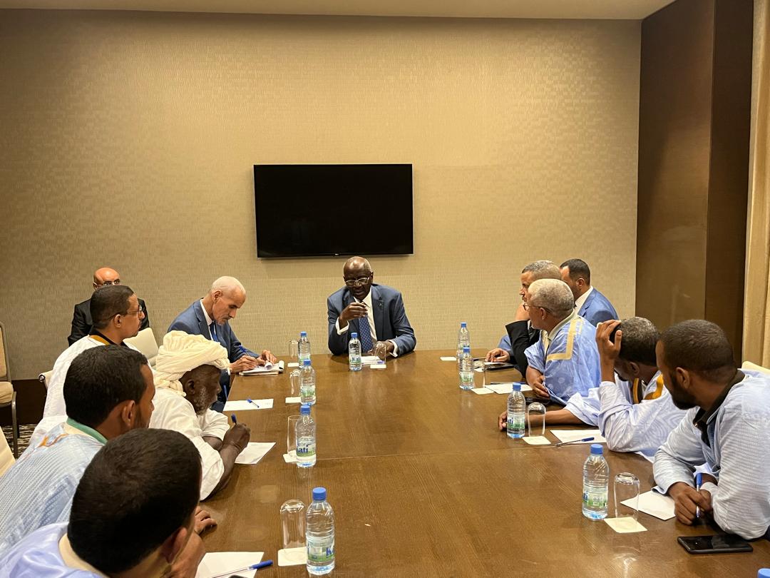 عقد وزير الخارجية محمد سالم ولد مرزوك، على هامش زيارته الرسمية إلى جمهورية مالي، لقاءً مع ممثلي الجالية الموريتانية المقيمة في هذا البلد، وذلك بمقر إقامته في باماكو، بحضور أعضاء البعثة الدبلوماسية والوفد المرافق له.