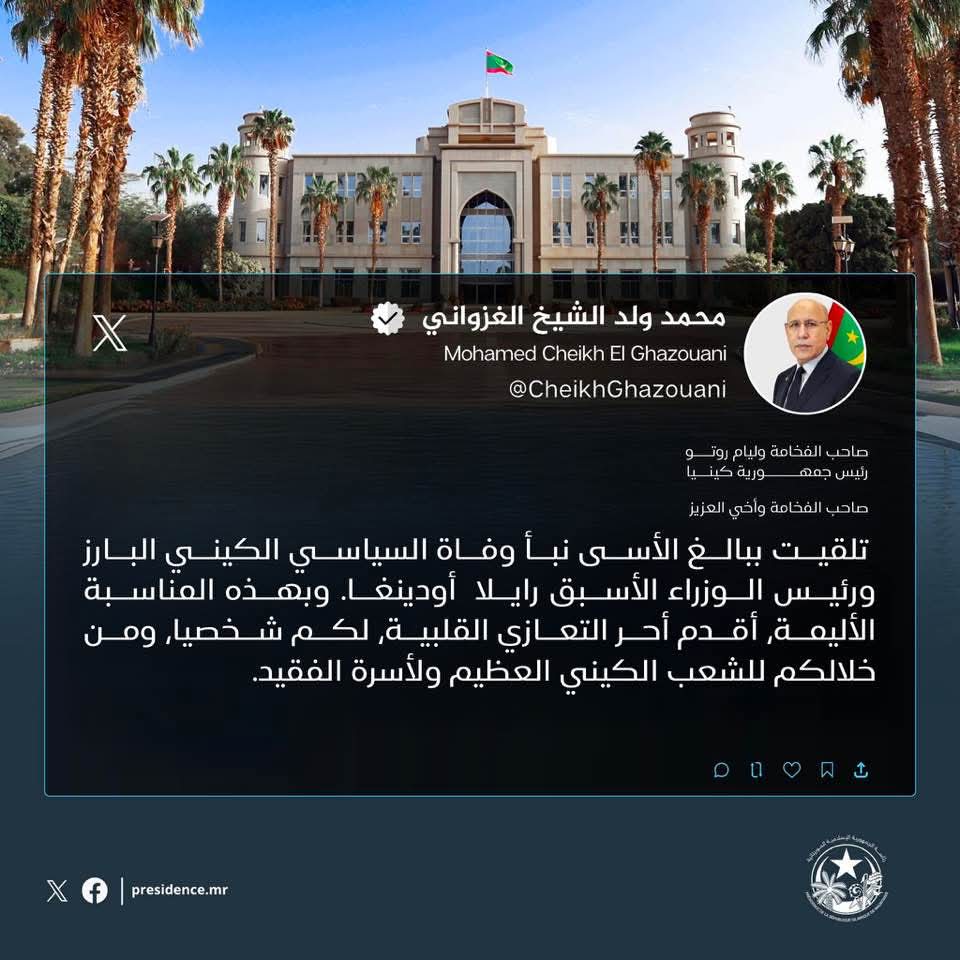 وجه رئيس الجمهورية محمد ولد الشيخ الغزواني، اليوم، برقية تعزية إلى وليام روتو رئيس جمهورية كينيا، إثر وفاة رئيس الوزراء الكيني الأسبق رايلا أودينغا.