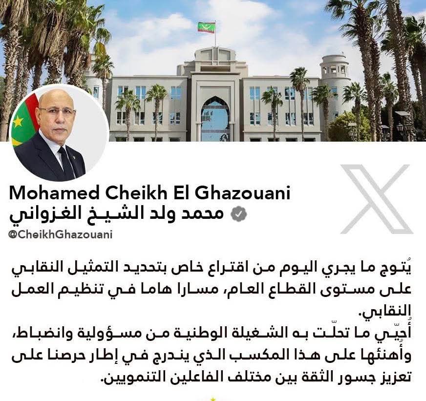 وصف رئيس الجمهورية محمد ولد الشيخ الغزواني في تغريدة عبر منصة "إكس"، اقتراع اليوم بأنه "يتوج مسارا هاما في تنظيم العمل النقابي".