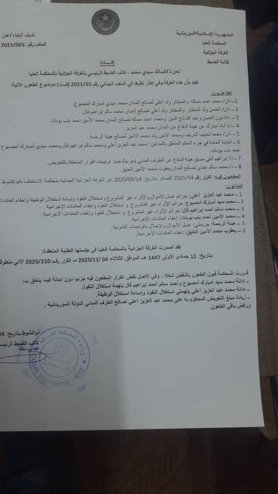 كما أيدت المحكمة العقوبات الصادرة بحق كل من محمد ولد امصبوع، صهر الرئيس السابق، والمرخي؛ ورجل الأعمال محمد الأمين ولد بوبات.