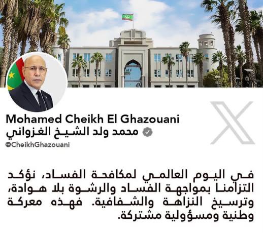 أكد رئيس الجمهورية محمد ولد الشيخ الغزواني، خلال تغريدة على منصة (X)، التزامه بمواجهة الفساد والرشوة بلا هوادة، وترسيخ النزاهة والشفافية.