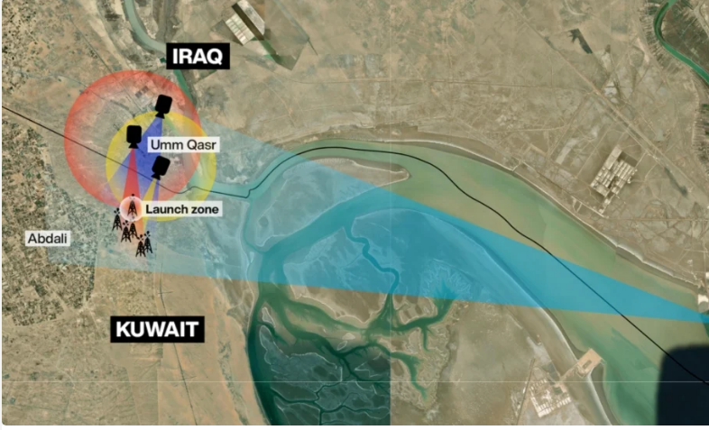 ومن خلال تحليل زوايا التصوير ومواقع الكاميرات مقارنة بالبنية التحتية النفطية داخل الكويت، تمكن فريق القناة من تحديد منطقة الإطلاق في الصحراء الكويتية شرق بلدة العبدلي، بالقرب من أبراج حفر النفط.