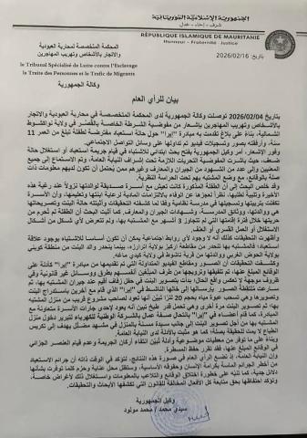 قررت النيابة العامة لدى المحكمة المتخصصة في محاربة العبودية والاتجار بالأشخاص حفظ المسطرة المتعلقة ببلاغ قدمته مبادرة "إيرا" حول حالة استعباد مفترضة لطفلة (11 سنة) بنواكشوط الشمالية، وذلك لانتفاء أ