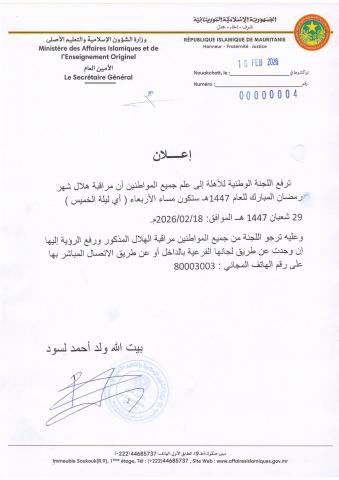 ترفع اللجنة الوطنية للأهلة إلى علم جميع المواطنين أن مراقبة هلال شهر رمضان المبارك للعام 1447هـ ستكون مساء الأربعاء ( أي ليلة الخميس )