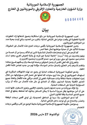 أعربت موريتانيا عن بالغ استنكارها وعميق قلقها إزاء التطورات الأمنية الخطيرة التي شهدتها الأراضي المالية مؤخرا، بالقرب من الحدود، والتي أسفرت عن مقتل عدد من المواطنين الموريتانيين.
