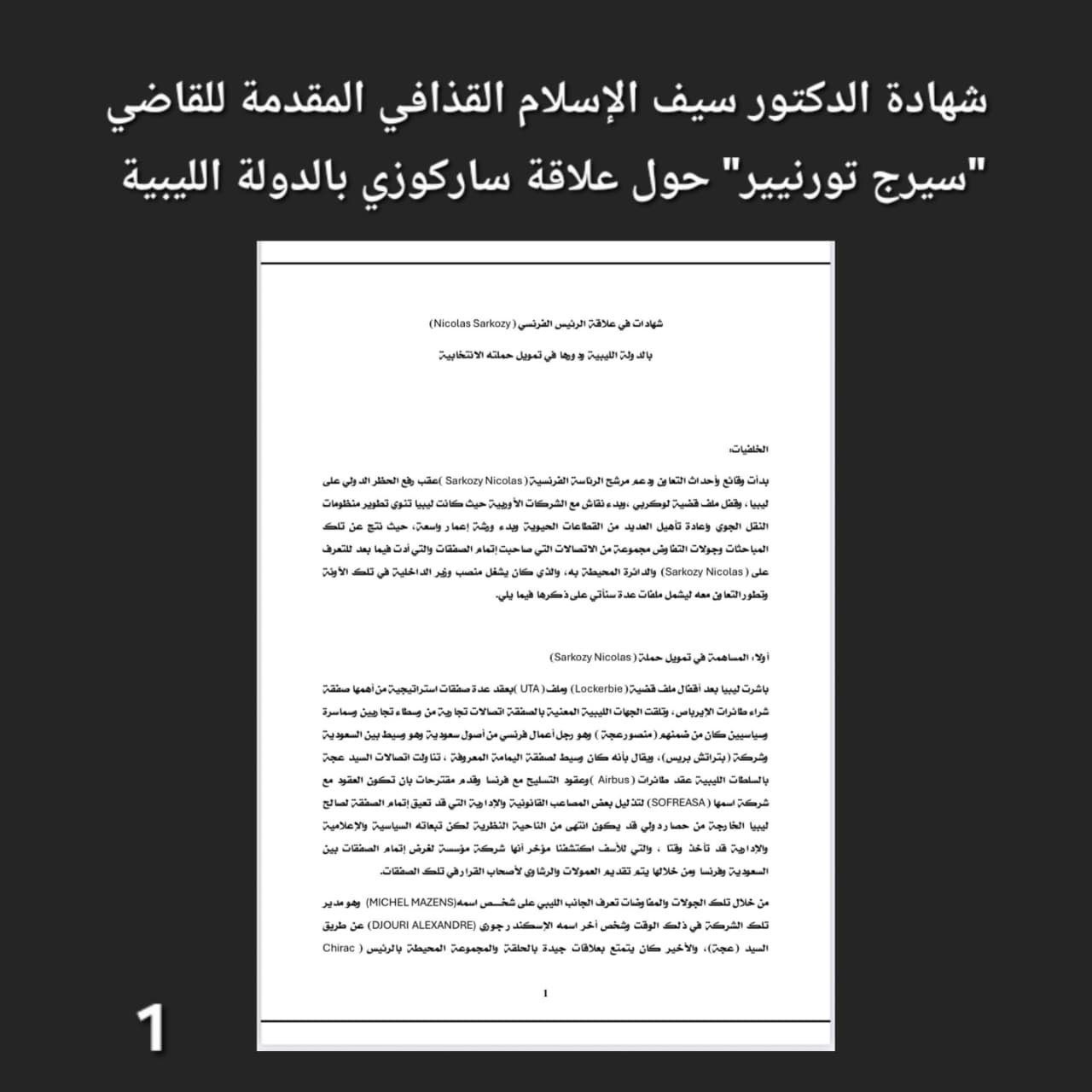 وزع الدكتور سيف الإسلام معمر القذافي في منشور جديد وثائق وشهادات رسمية تؤكد تورط الرئيس الفرنسي الأسبق نيكولا ساركوزي في تلقي أموال من الدولة الليبية خلال حملته الانتخابية عام 2007، وذلك في خطوة اعتُبرت تأكيدًا لما سبق أن كشفه في تصريحات سابقة منذ عام 2011.