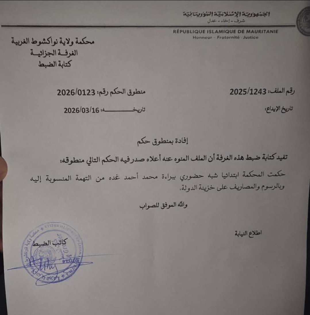 برّأت محكمة ولاية نواكشوط الغربية اليوم رئيس منظمة الشفافية الشاملة محمد ولد غده من التهم الموجهة إليه، وذلك بعد أن استعرض أدلة براءته أمامها الخميس الماضي.